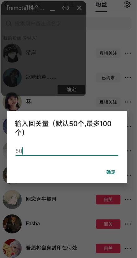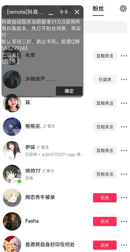抖音自动回关1.0回关粉丝列表,可设置间隔几秒点击一个关注