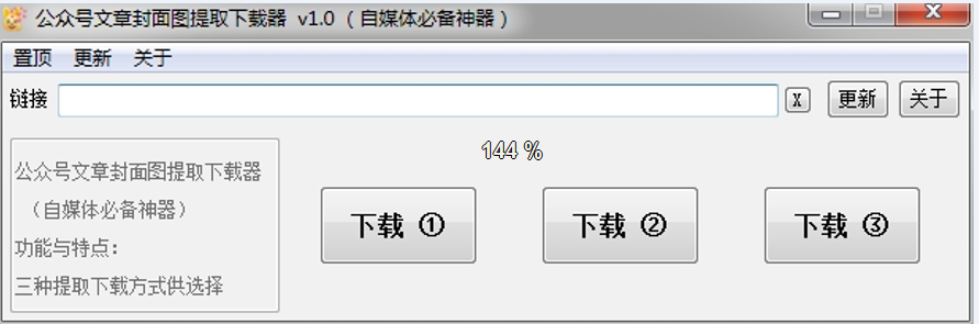 功能与特点: 1、公众号文章封面图提取下载 2、三种提取下载方式供选择 3、【置顶】可以将软件置顶