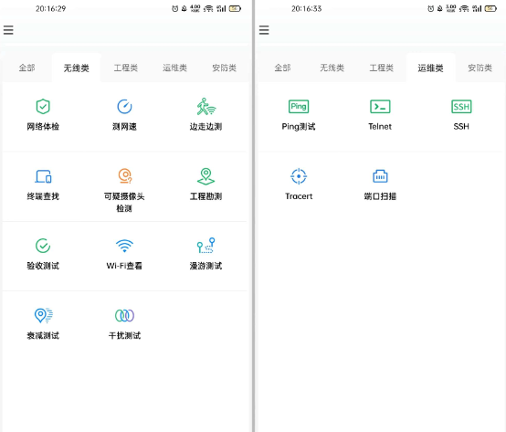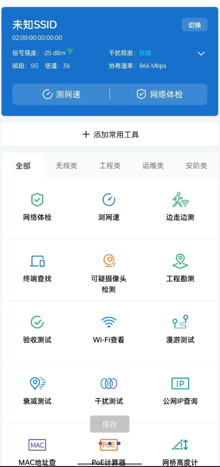 软件中有无线类、工程类、运维类、安防类四种类型的网络检测工具,涵盖了网络体检、测速、边走边测、可疑摄像头检测、Ping测试等多种工具,基本可以满足非专业用户的绝大多数需求!