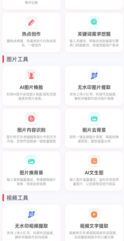 新增,AI抠图,AI图片换背景【电商换图】,Ai绘图,热点创作,关键词探索等