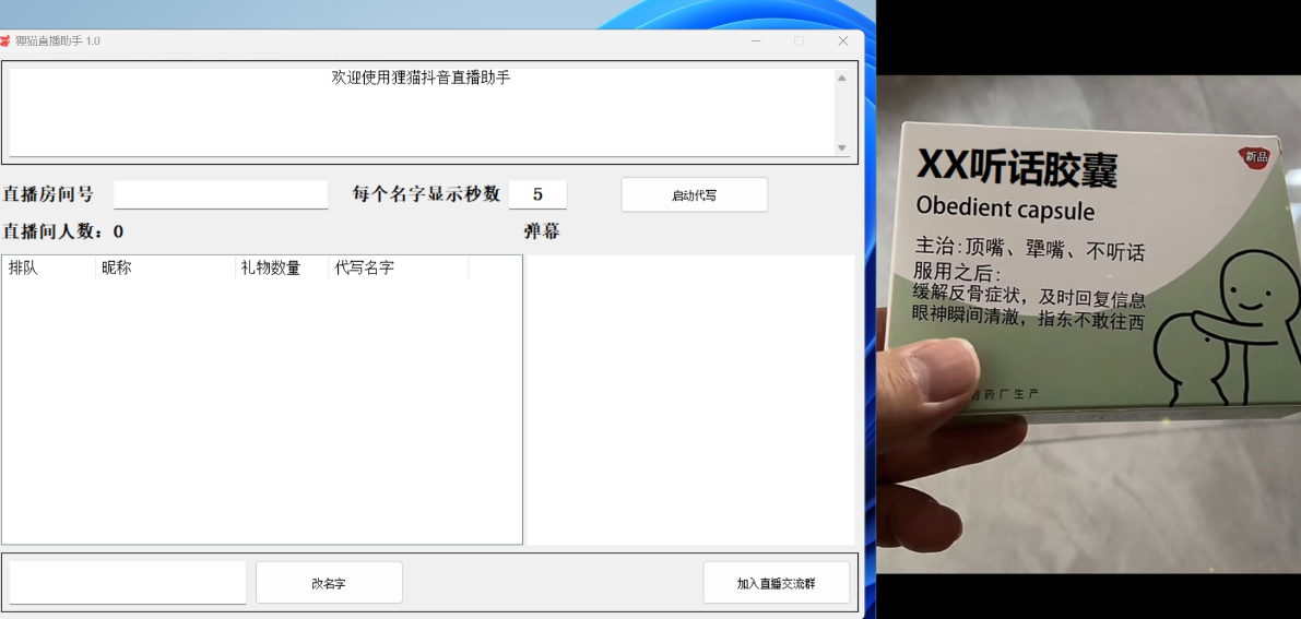 玩法简介,分享直播链接 填写链接后面的房间号,也就是那串数字,点击(启动代写) 即可 有人赠送小星星自动排队等待改名,多送自动排名靠前,大于10颗直接插队 就不多说了,懂的都懂,直接开始直播赚米吧