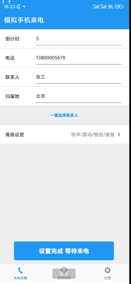 一款模拟手机来电APP,自定义设置模拟来电者昵称、头像、电话号码、铃声、震动方式等
