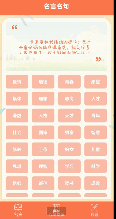 名言名句大全 一款非常好用的服务类软件,为你提供了大量的名言名句,通过简单的搜索就可以找到自己需要的经典语句,并且涉及的范围非常广泛,文学,历史,哲学,艺术等各个领域,都可以让你找到相应的句子,来满足自身的需求。(解锁去除广告)