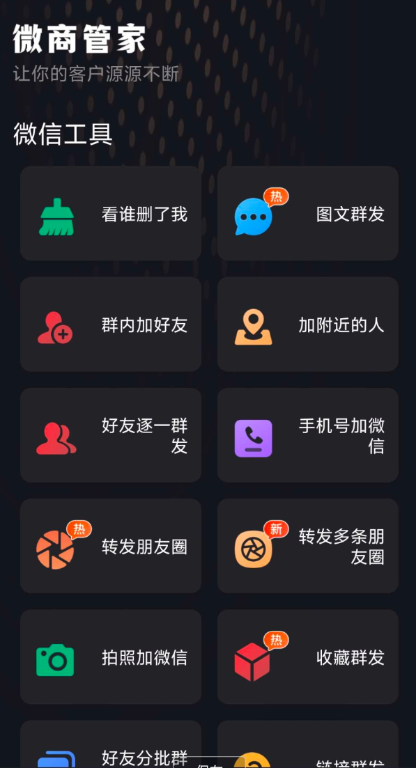 微商管家是一款专为微商、社交电商从业者与自由职业者量身定制,集客户拓展、一键群发、微商营销与社群管家于一体的微商助手软件。