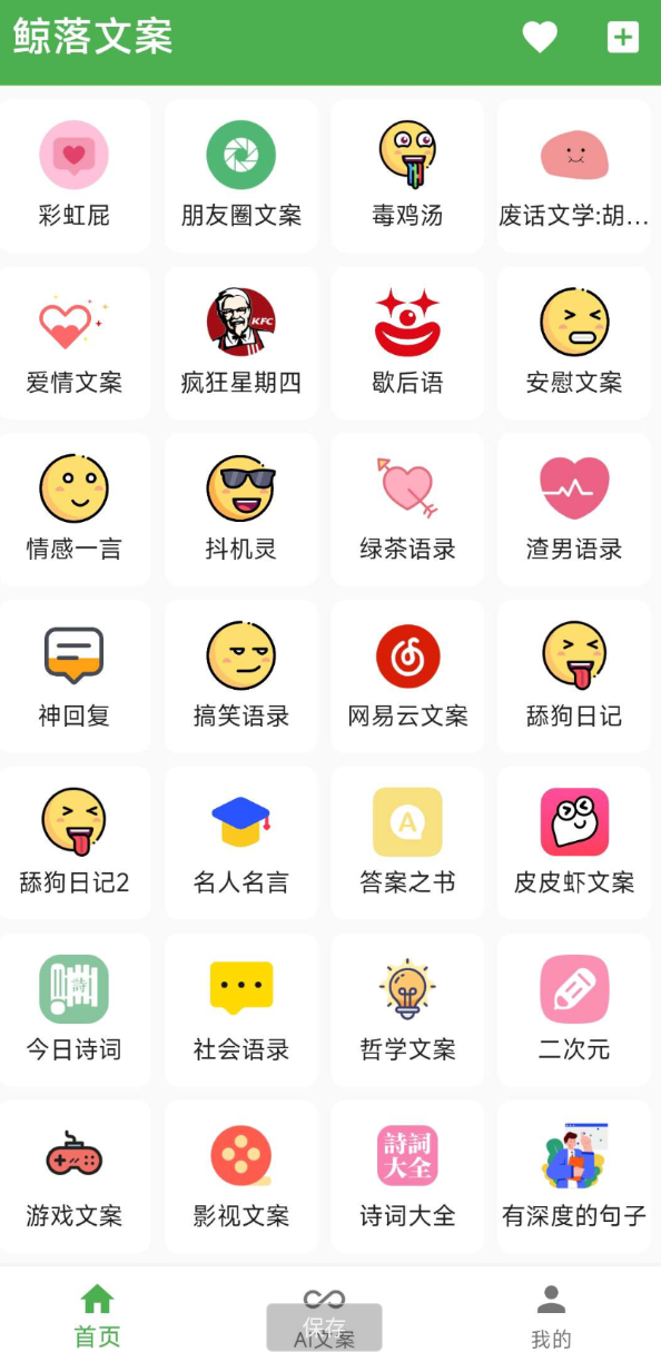 【应 用 介 绍】:内包含彩虹屁、朋友圈文案、绿茶语录、舔狗语录、网易云神评、今日诗词、社会语录、二次元、抖音文案等几十种文案主题。