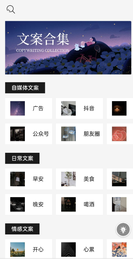 这里汇聚了海量的文案素材!简洁大方的UI设计,致力于打造一款简单好用的文案APP!