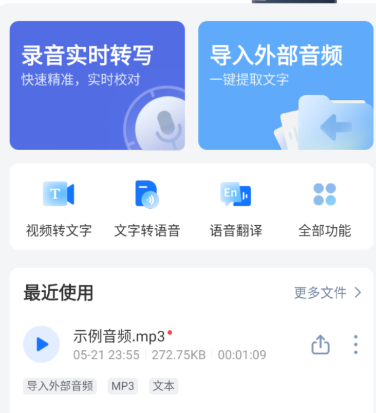 【楼主点评】:录音转文字助手是一款多功能的语音识别与翻译应用,旨在帮助用户快速将语音和音频文件转换为文字,并提供多种实用功能,全面提升工作和生活效率。不仅支持实时语音转文字和智能翻译,还内置了文字配音、视频转文字、音频编辑处理等实用小功能,满足用户各种录音和文字处理需求。【应用名称】:录音转文字助手