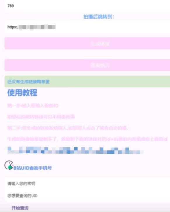 照妖镜源码 功能齐全ui好看搭建什么的也方便 使用方式就是输入id,会生成一个链接,点击者点击链接,然后其照片就会被保存下来,可以通过凭证来查看 本工具仅做学习交流使用,请勿用于非法用途!后果自负!网站拍照是用户自愿点击允许 搭建教程 1、把压缩包文件上传至根目录解压 2、修改sc.php里面的链接改为自己的 注意:域名需要设置SSL证书