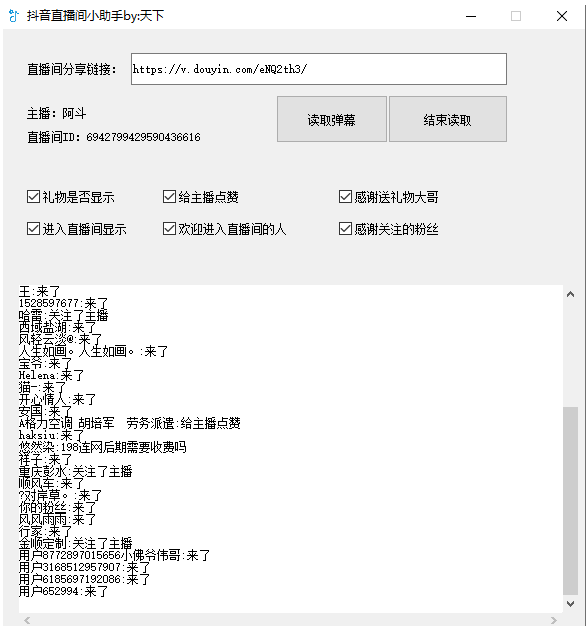 1.读取抖音直播间的弹幕解析 2.语音 欢迎进入直播间的人 3.语音感谢 送礼物的大哥 4.语音感谢关注的粉丝 5.自动给主播点赞 6.自动回复