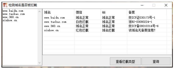 在购买二手域名或者注册新域名之前可以查询一下,该域名是否被拦截,如果被拦截就可以换个域名,避免不必要的损失,软件是几个月前写的,今天无意间翻出来的,就分享出来了。 使用方法:左侧输入需要查询的域名。一行一个,然后点击查询即可,查询出来后会显示这个是属于什么拦截级别,对应的拦截级别也可以在软件中查看!