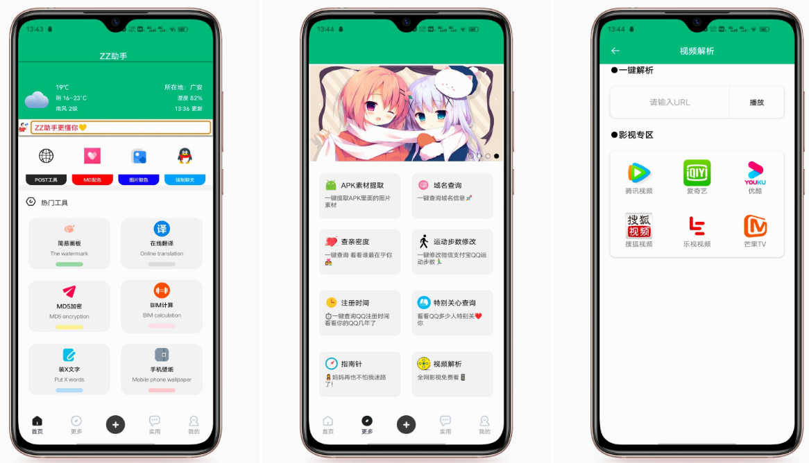 zz助手助手是一个实用的工具箱软件,目前有网页取源,POST工具,配色参考,MD图标,包名查看,视频解析,扣扣强制聊天