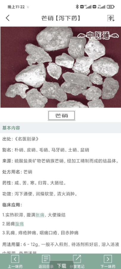 每一种药物里面都有很详细的介绍,如图,出处、别名、来源、处方用名、使用注意事项、用量、搭配使用等介绍。