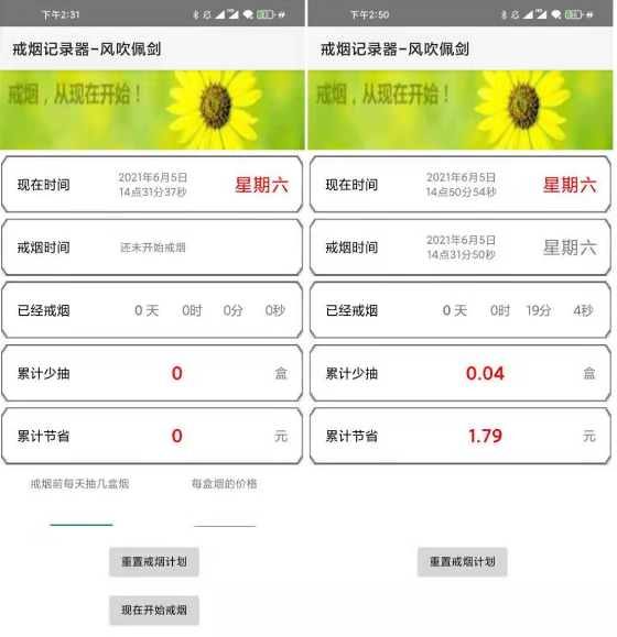 「软件名称」戒烟记录器 「软件版本」1.0 「软件介绍」最近想戒烟,下载了一些戒烟计时软件,发现广告较多,且软件比较复杂,就想找一个简单记录戒烟时间的app,可惜一直找不到。没办法,就自己用易安卓写了一个,以供想戒烟的朋友使用。