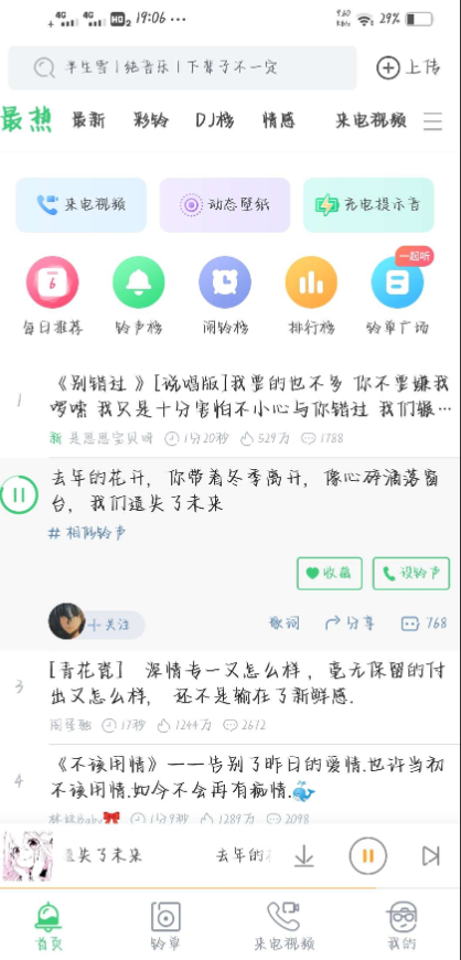 火热铃声实时更新,把握时尚风向标,网罗分享量超高的铃声,汇总个性又流行的彩铃(炫铃)……