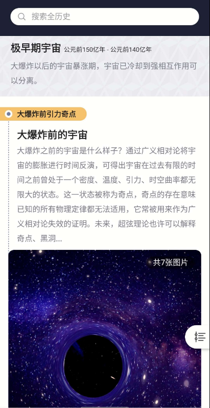 一款很实用的学习工具,界面清爽简洁,而且实用性很强拥有一条时间轴,从宇宙大爆炸到地球起源,从生命起源到现代文明,一条线给你全讲解