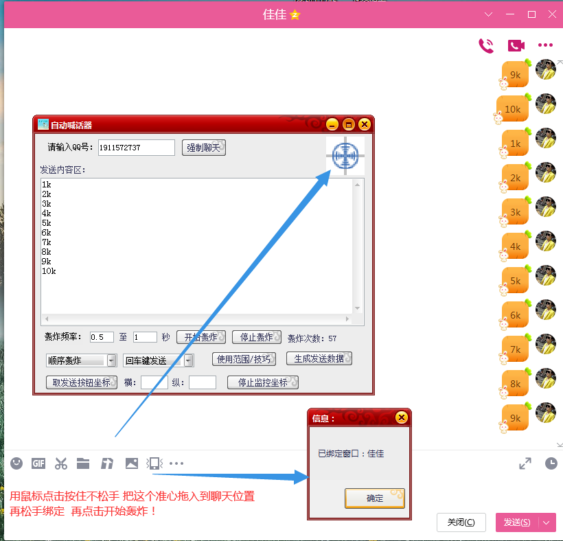 说明:可装虚拟机后台运行软件,不影响电脑其他操作!详情咨询 功能:炸扣、炸微信、刷屏、游戏刷喇叭、自动喊话、互怼等,更多玩法自行开发。 1.适用于几乎所有发消息的窗口,穿透力更强!可以穿透大多数游戏 2.回车键发送和鼠标点击发送两种方式,适配大多数场景 3.发送速度可以自定义,支持毫秒级发送 4.轰炸次数统计,发送了多少次一目了然