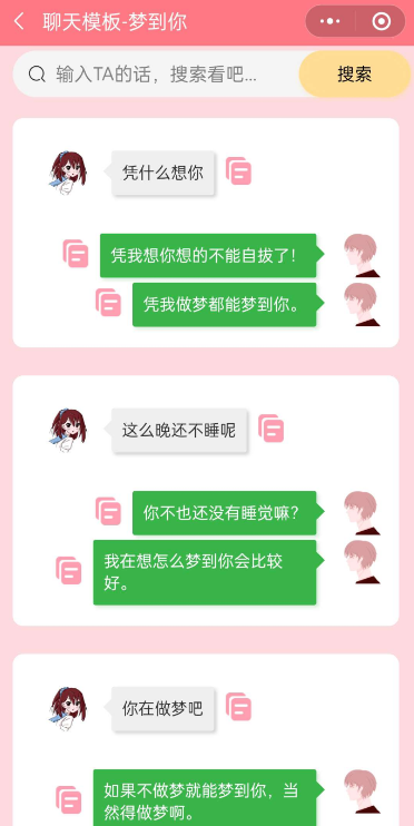 【小程序内容】:一款免费好玩的微信小程序,海量话术库类型供提大家体验,总之,没有你找不到的,只有你想不到的,聊天升温必备良心软件,再也不用担心找不着对象而烦恼了