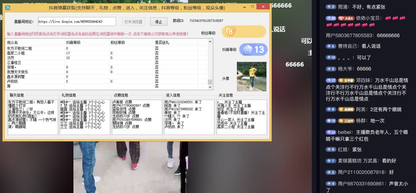 (支持聊天,礼物,点赞,进入,关注信息,抖音等级,粉丝等级,观众头像) 本软件只供学习。