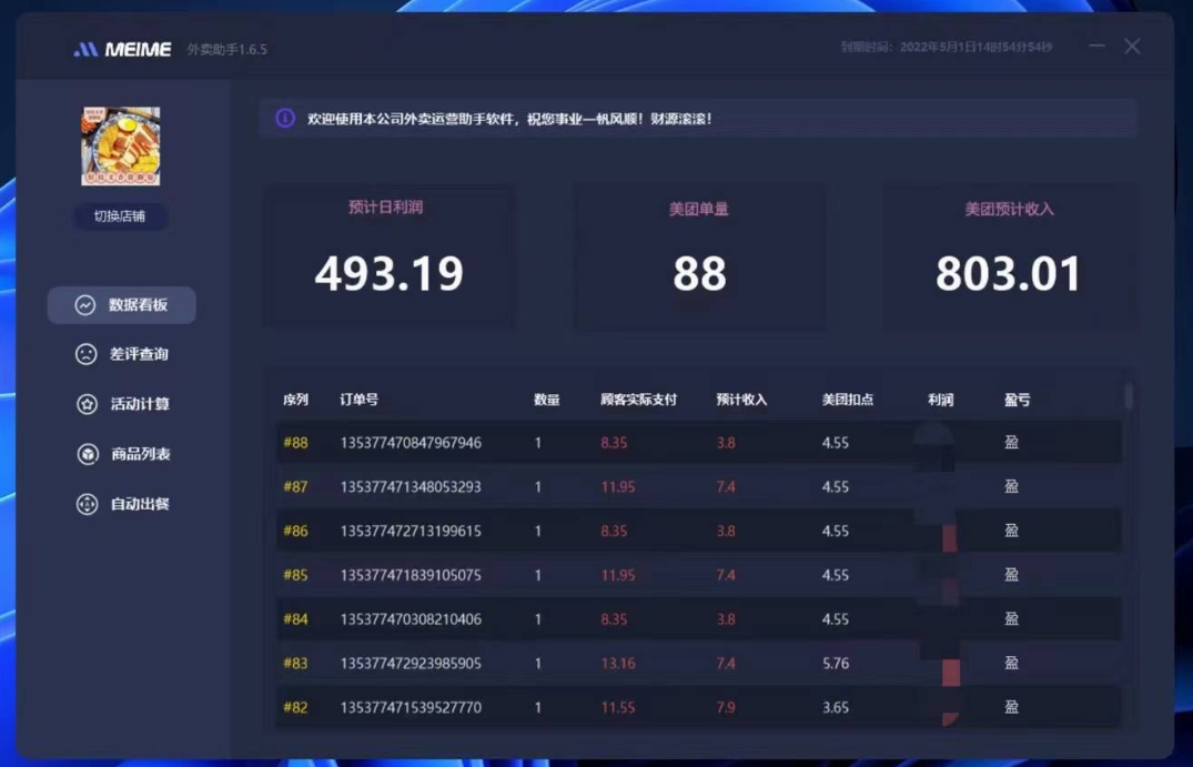功能有来单统计利润,活动计算,自动出餐等功能,帮助一些商家有更高效率的运营店铺