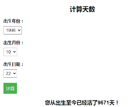 引流HTML单页面,选择出生年月日,然后计算出自己从出生至今活了多天。