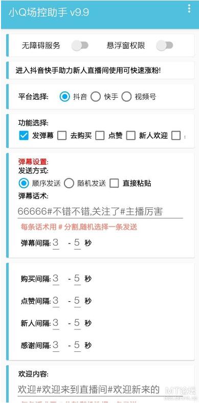 软件简介 场控机器人最新9.0版,直播暖场滚屏神器 软件开启后全自动运行,模拟真人操作,帮助主播们解放双手,活跃直播间气氛。 软件可设置直播间自动点赞,自定义内容自动打字互动,飘小红心,自动@新来的小伙伴并致欢迎词,自动@送礼物的大哥致感谢词,去别人直播间也可以帮您快速涨粉,是直播间加热互动必备的好助手。