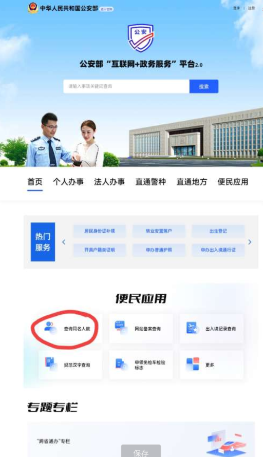 进入平台后下方有个便民应用,位于便民应用,第1个便是查询同名人数,需要登录并且每天有次数限制